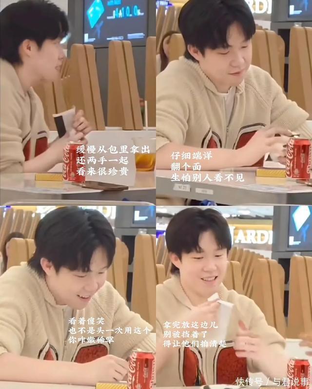 头哥在自己包里拿出一包熊猫纸巾, 这个表情确实挺好玩, 纸巾拿出来,脸上都是带着笑的, 这款纸巾后面也可以打开, 但是头哥还是在正面熊猫处打开了, 网友说,他是故意让你们拍的, 还把纸巾放在桌子上,熊猫朝上。